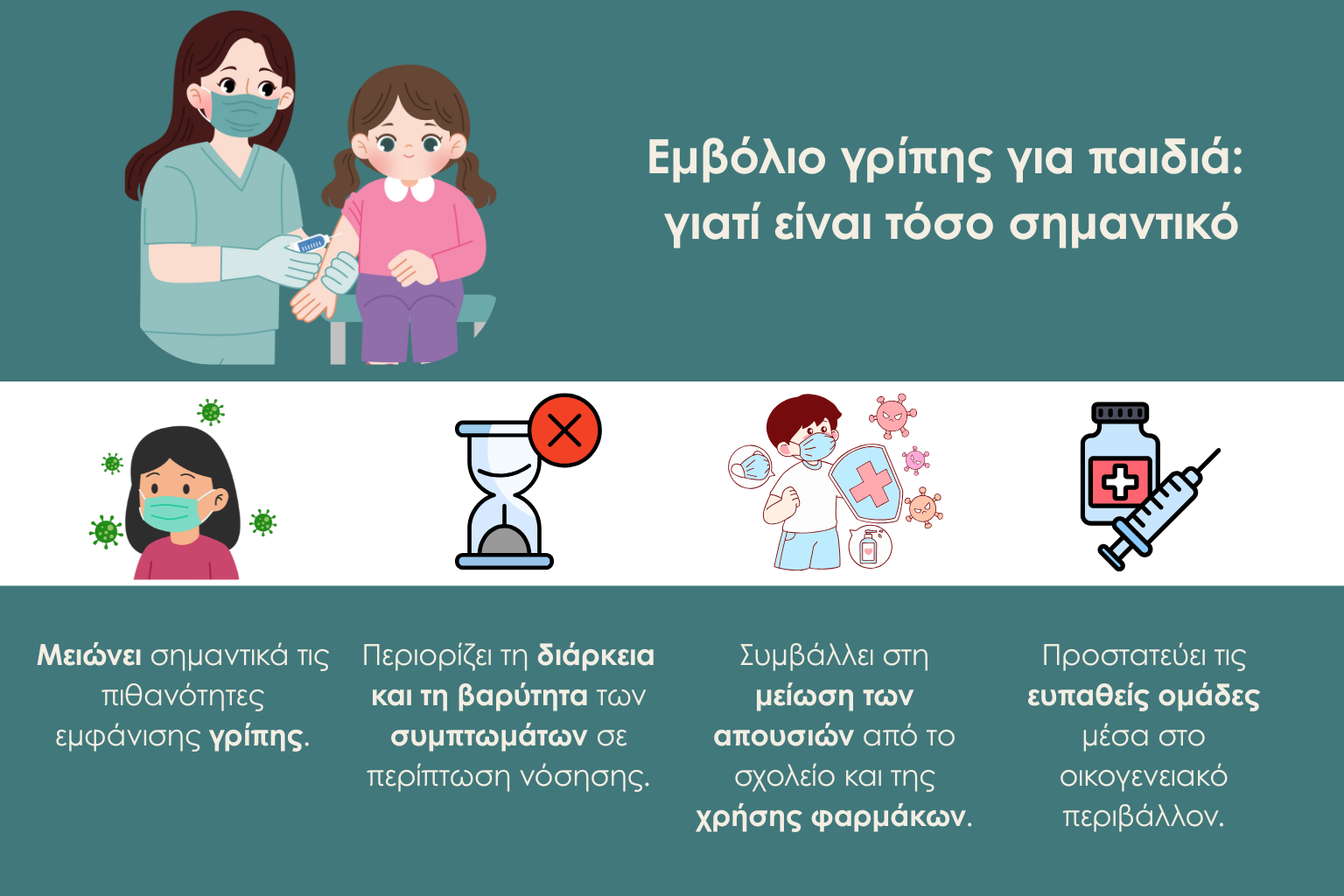 Πλεονεκτήματα του παιδιατρικού εμβολιασμού:- Μειώνει σημαντικά τις πιθανότητες εμφάνισης γρίπης.